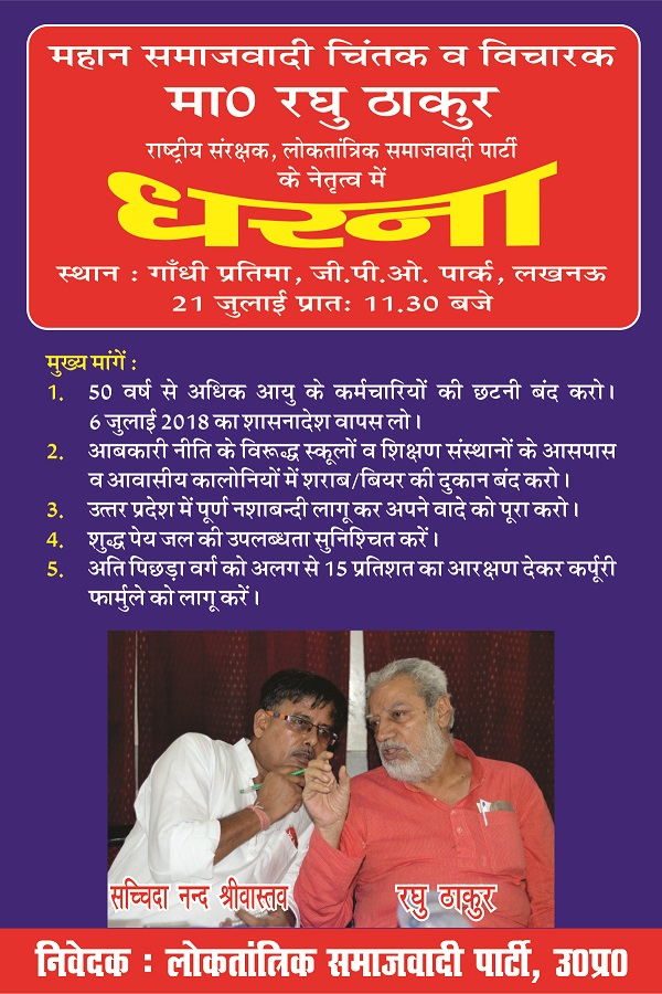 21जुलाई को लोकतांत्रिक समाजवादी पार्टी का लखनऊ में धरना