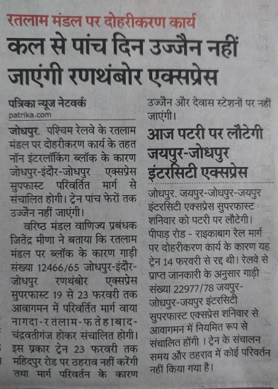 जोधपुर (NWR): DRM जोधपुर ने ट्वीट कर बताया है कि, रतलाम मंडल में दोहरीकरण कार्य के कारण रणथंबोर ...View More