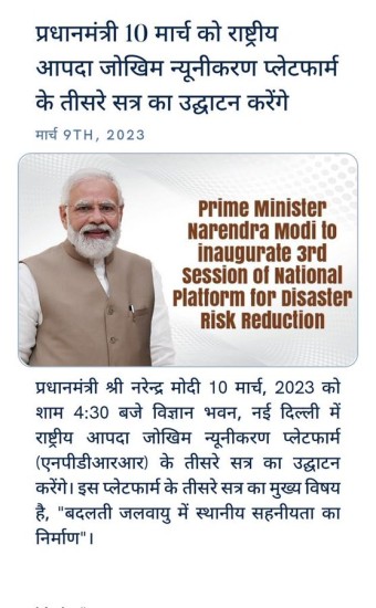 प्रधानमंत्री 10 मार्च को राष्ट्रीय आपदा जोखिम न्यूनीकरण प्लेटफार्म के तीसरे सत्र का उद्घाटन करेंगे: प्रधानमंत्री कार्यालय